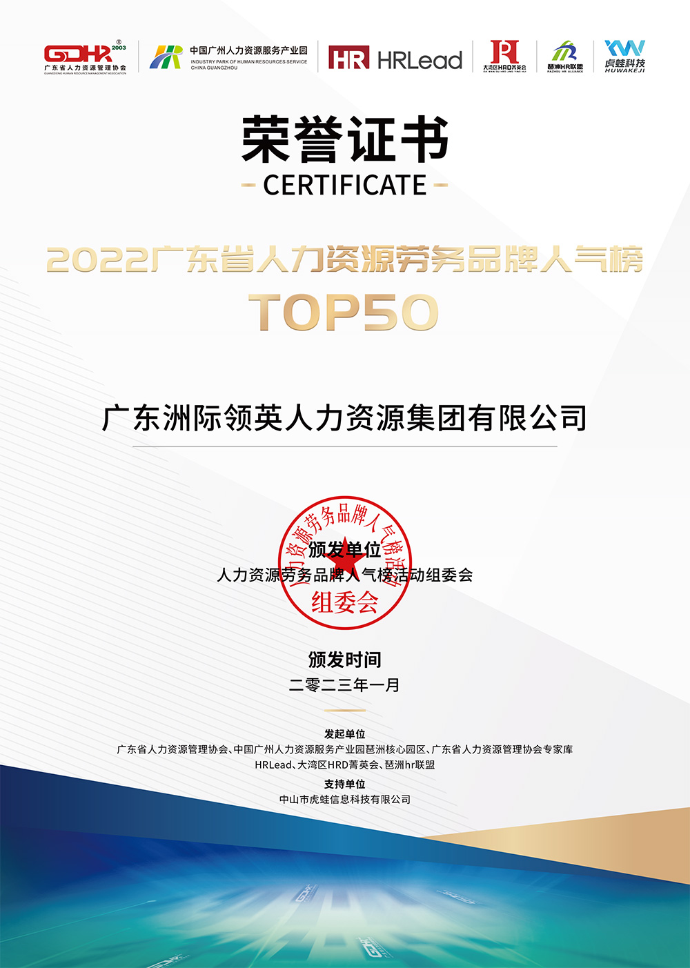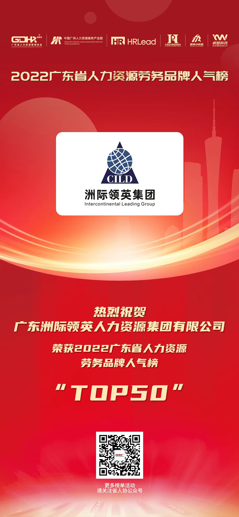 熱烈祝賀廣東洲際領(lǐng)英人力資源集團(tuán)有限公司榮獲2022廣東省人力資源勞務(wù)品牌"Top50"